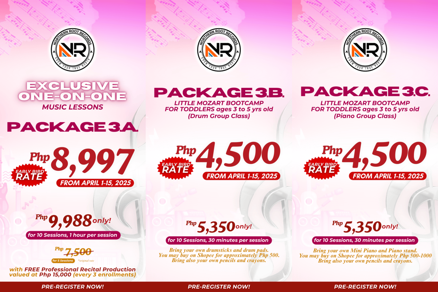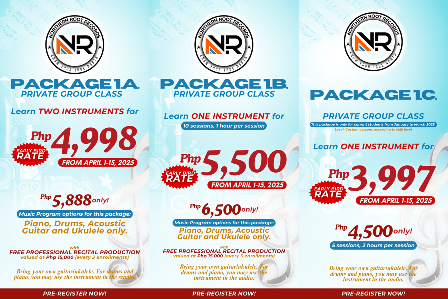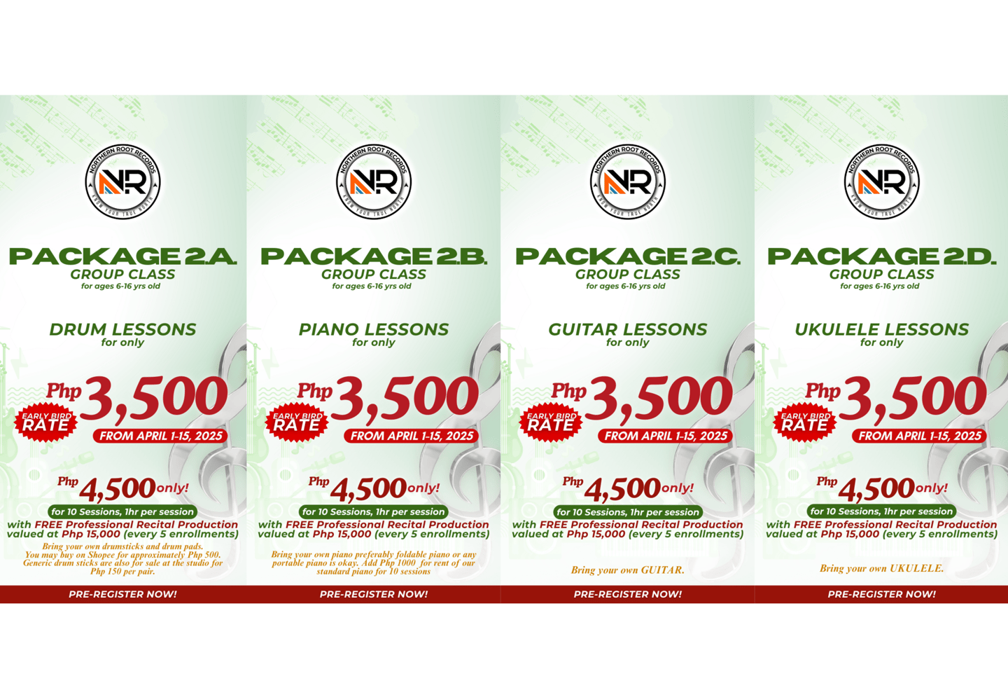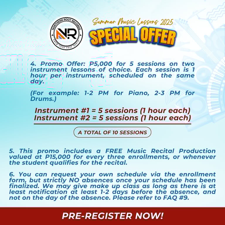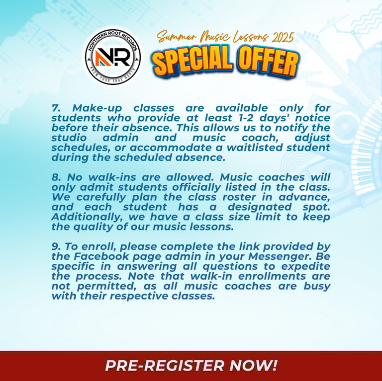 For Private Group Class and Exclusive One on One Class, YES WE DO. But you must notify our page or our app at least 24 hours in advance to avoid being charged with a rebooking fee of P350. We need 24hr lead time to inform the music coach and the studio admin for them to make necessary adjustments in the schedule and to book waitlisted students who are interested to take your schedule. We assume that you agree to this terms and conditions once you fill up our enrollment form.