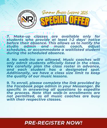 For Big Group Class (SUMMER PROMO CLASS), strictly no absences, and no make up classes will be given because during your enrollment, you will CHOOSE your own schedule to avoid absences. This can be done by messaging us on messenger to finalize your schedule. Once your schedule is final, it will be officially booked in our class list. We have a limit per class, so once it reaches its maximum capacity, we will no longer accept enrollees. Every student in the class is carefully planned by the management, so please try your best not to get absent :) Rebooking fee is P350.